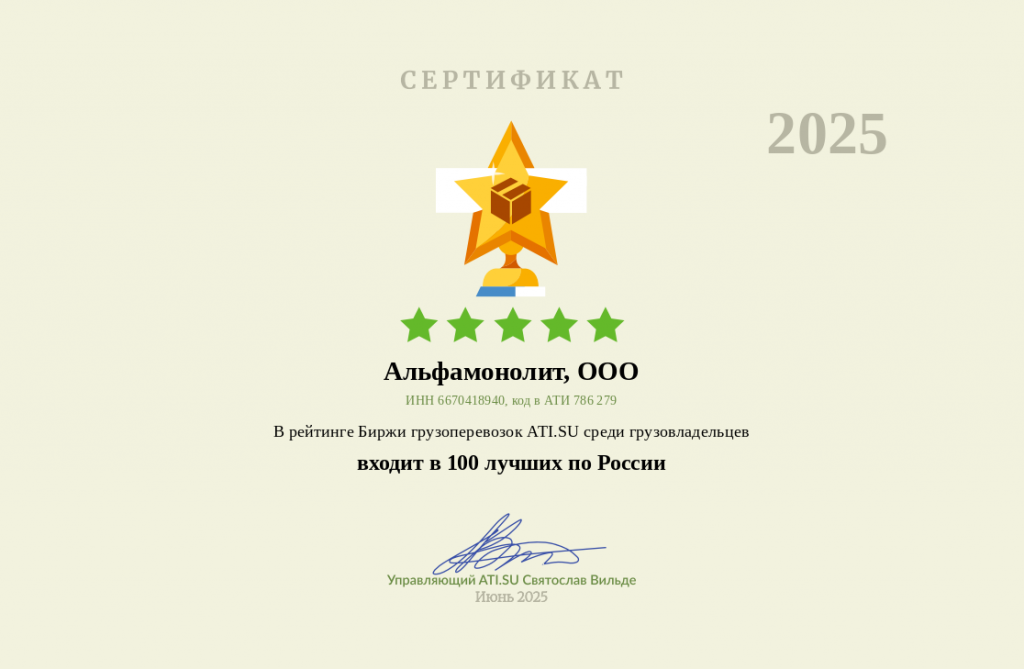 Компания «Альфамонолит» удостоилась престижного признания, войдя в топ-100 лучших грузовладельцев России по итогам рейтинга Биржи грузоперевозок ATI.SU. Этот сертификат подтверждает высокий уровень надежности и профессионализма компании в сфере логистики и грузоперевозок.